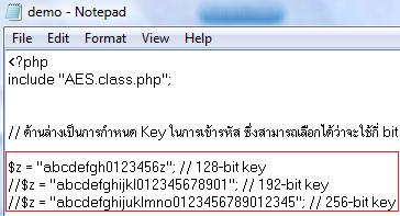 4. แต่อยากให้ดูในไฟล์ demo.php นิดนึงครับ จะเห็นว่าสามารถใช้ Key ได้ 3 รูปแบบ คือ 128,192 และ 256 bit เลือกได้อันใดอันหนึ่ง