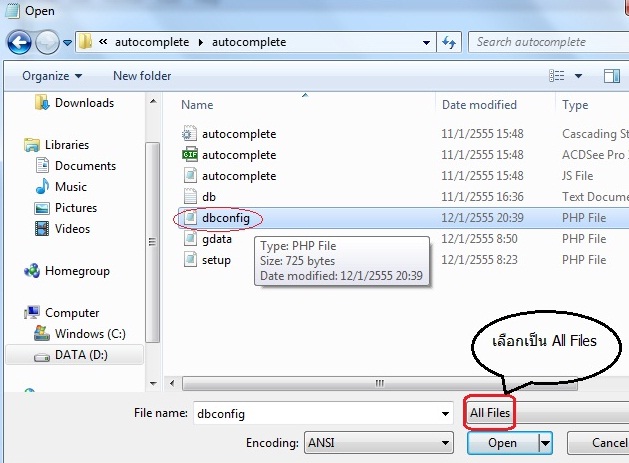 4. ใช้โปรแกรม Notepad (อยู่ที่ Start -> All Programs -> Accessories -> Notepad) เปิด File ชื่อ dbconfig.php ครับ