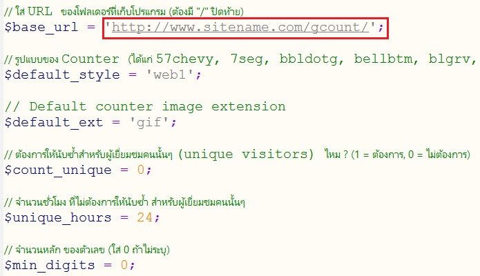 3. ตั้งค่าการใช้งานได้ที่ไฟล์ gcount/gcount.php ครับ (ผมเขียนอธิบายเป็นภาษาไทยไว้แล้ว)